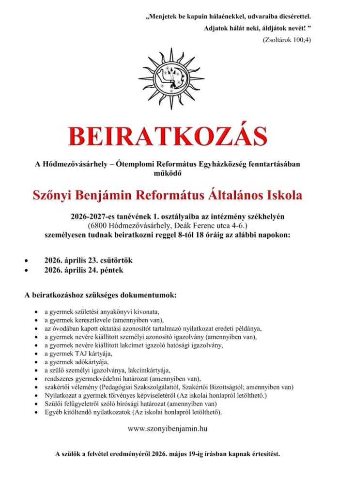 A Szőnyi Benjámin Református Általános Iskola a 2026-2027-es tanévre 3 első osztály indítását hirdeti meg.