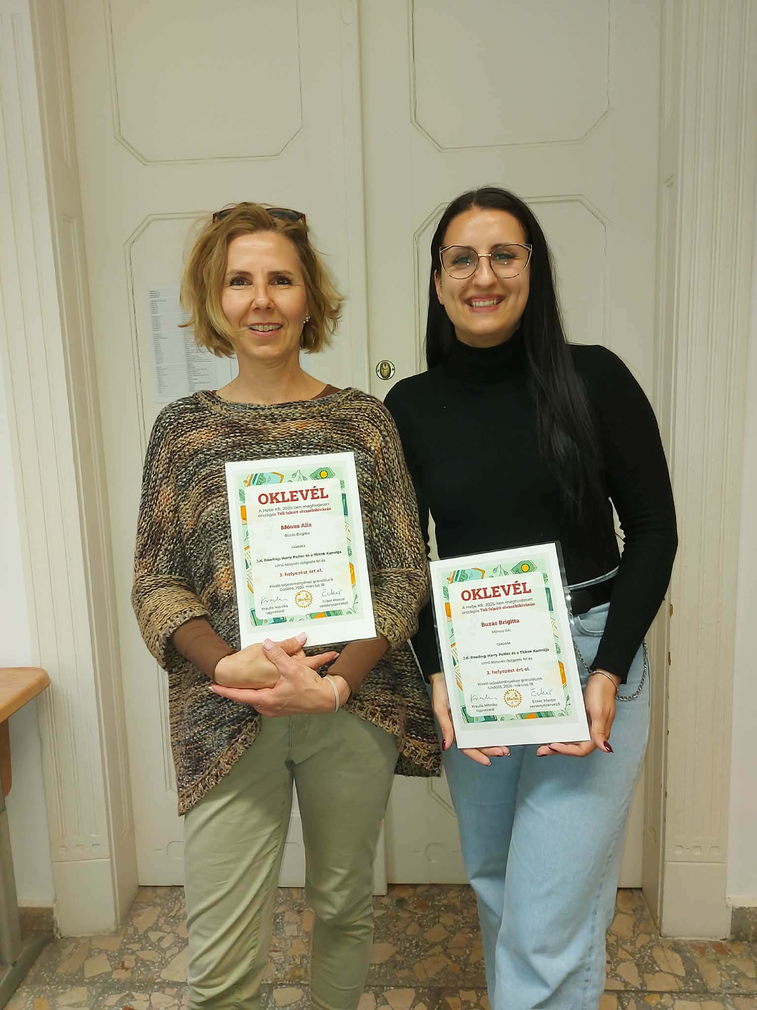 A HEBE Kft. olvasni imádó felnőtteknek Téli Olvasóversenyt szervezett a 2025-ös évben. A Szőnyi Benjámin Református Általános Iskola kèt pedagógusa, Mónus Aliz és Buzás Brigitta csoportosan neveztek a versenyre J.K. Rowling: Harry Potter és a Titkok Kamrája című könyv elolvasásával és feladatsorainak megoldásával 3. helyezèst értek el.