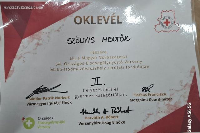 Idén a Szőnyi is képviseltette magát ezen a nemes versenyen. A 8. évfolyam tanulóiból alakult "Szőnyi Mentők" csapat az előkelő 2. helyezést érte el a Makó-Hódmezővásárhely területi fordulón!